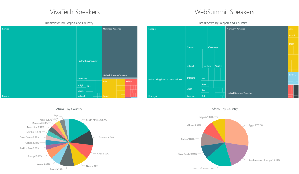 VivaTech has made a special effort to close the gap (from 25% women speakers in 2016 to 40% women speakers in 2018). As VivaTech is trying to internationalize, it still struggles to find women speakers from the US Tech Stars : the % share of women is much higher among European Speakers. Interesting also, there are MORE African women speakers than African men speakers. How nice when a speaker ticks two boxes at once (gender and ethnic diversity).